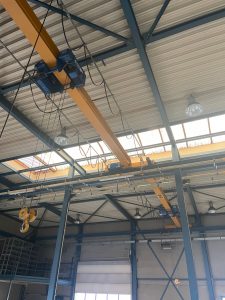 Die Andienung der Hallenflächen erfolgt über 2 Sektionaltore. In der Halle sind 2 Kranbahnen /Traglast 5 Tonnen) eingebaut.