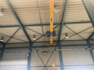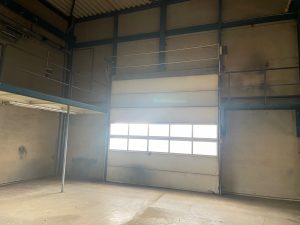 Die Andienung der Hallenflächen erfolgt über 2 Sektionaltore. In der Halle sind 2 Kranbahnen /Traglast 5 Tonnen) eingebaut.